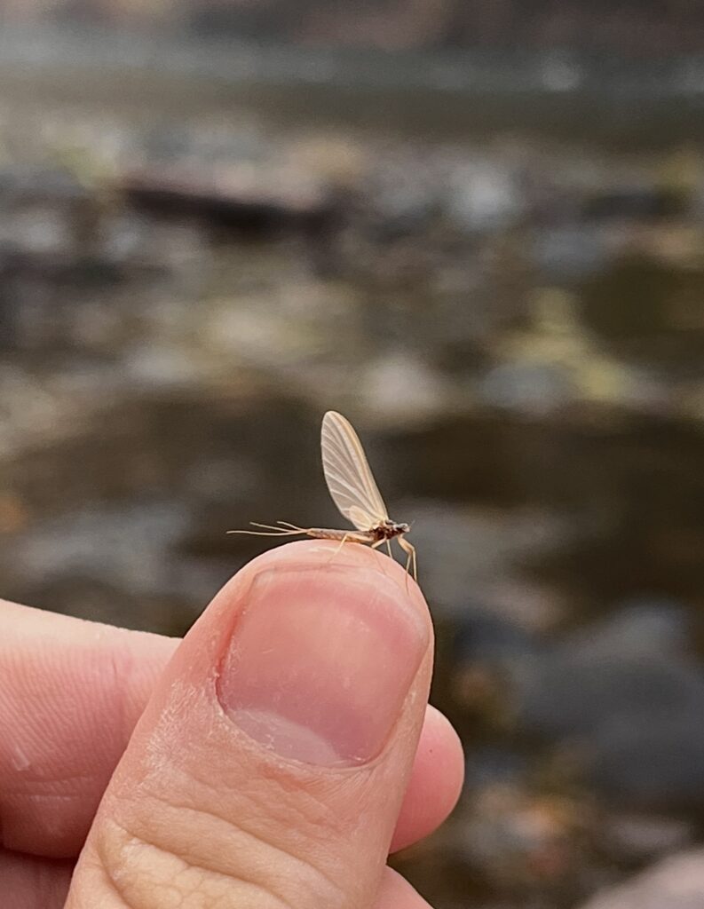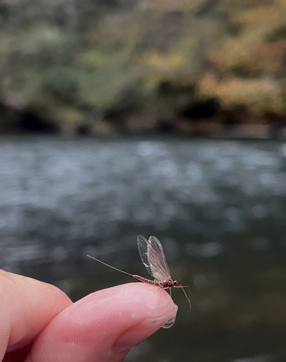 The big player in terms of aquatic insect hatches is the Baetis family of mayflies also known as Blue Winged Olives or BWOs. With our cooler weather, these mayflies will hatch on overcast days during the middle of the day. They are often found hatching in more calm water, and most of the time trout will be seen rising to emerging duns. We are beginning to see our first hatch of small winter stoneflies. Female October caddis are still lingering around and will been ovipositing, or laying eggs, in the river on cloudy days during the day or in the evenings. Mahogany Dun Spinners can be found congregating in the evening and the fish will key into a spinner fall of them. There are a few leftover small caddis that are on their last leg.