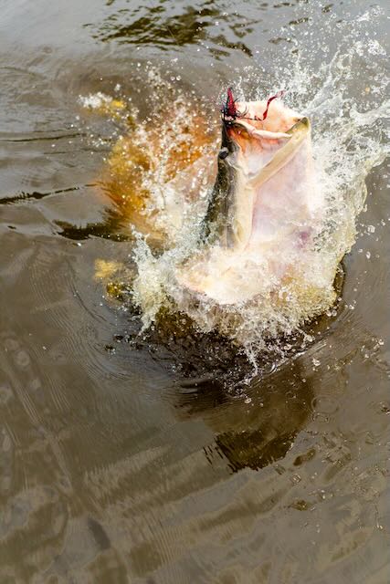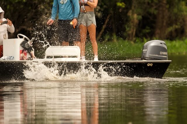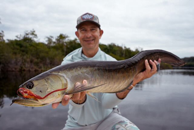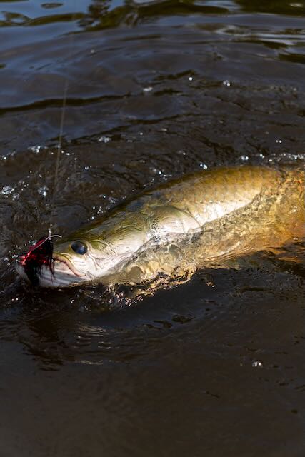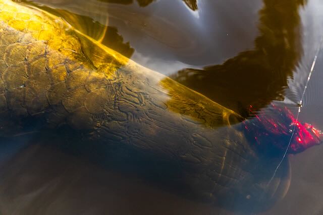 The water was extremely high for September, our guides were in week three of about a 14 week season. They had never seen the water this high! Pirarucu’s season starts in late August and finishes in November. This timeframe is chosen for low water! Which was not the case for our stay. Huge masses of grass floated down the river, trees were submerged 5-6ft underwater and there was no visible river bank. Fishing was tough but rewarding. With the high water fish were not concentrated and were able to feed literally inside the jungle. You could see and hear these monsters rolling 50 yards back in the jungle. Other species that are normally available to anglers such as Arawana and Tambaqui were also deep in the cover and we had no shot at those until the last day when the water had finally dropped enough in a few spots that the fish decided to come out to some degree.